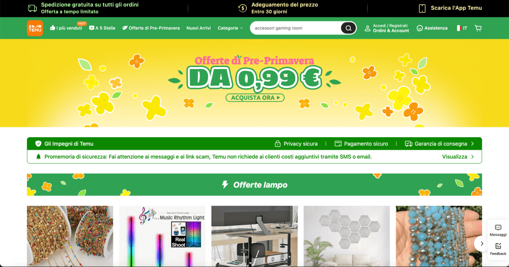 Temu.com accoglie gli utenti con un design moderno e accattivante, progettato per offrire un’esperienza di navigazione fluida e piacevole. La homepage è pulita e ben organizzata, con una navigazione intuitiva che consente agli utenti di trovare facilmente ciò che cercano. Le categorie sono chiaramente delineate, mentre la barra di ricerca permette ricerche rapide e precise.